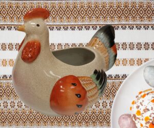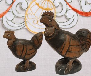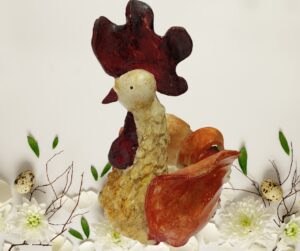 W bibliotecznych gablotach zaprezentowano bogaty zbiór figurek kur, kogutów oraz charakterystycznych naczyń – dwojaczków. Eksponaty wykonane zostały z różnorodnych materiałów, a każdy z nich wyróżnia się indywidualnym stylem, fakturą oraz formą. Kolekcja zachwyca nie tylko estetyką, ale również odwołuje się do bogatego dziedzictwa kultury ludowej, w której motywy zwierzęce odgrywają istotną rolę symboliczną.