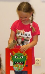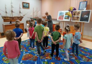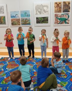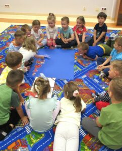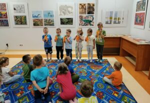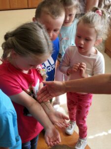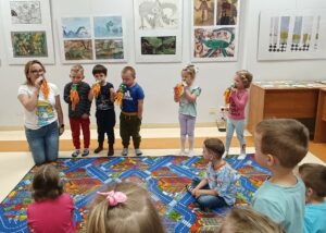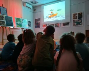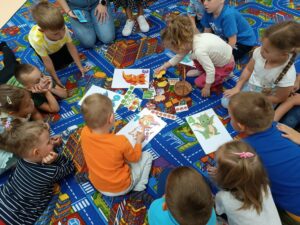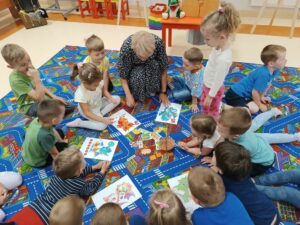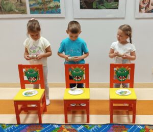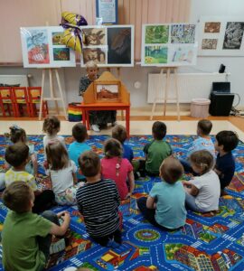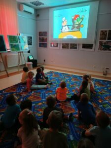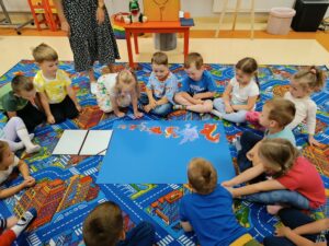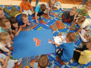 Oczywiście nie mogło zabraknąć legendy o najsłynniejszym polskim smoku – Smoku Wawelskim. Jego historię dzieci poznały słuchając opowieści zaprezentowanej metodą Teatrzyku Kamishibai.
