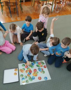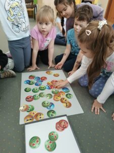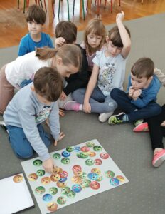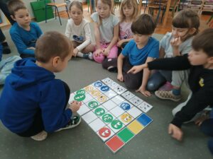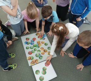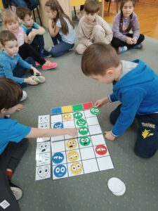 Dużym zainteresowaniem cieszyły się również zabawy z emotkami, wykorzystywane w pracy biblioterapeutycznej i edukacyjnej. Dzieci porządkowały je według określonych cech, kodowały i wyszukiwały emocje, łącząc naukę z aktywną zabawą.