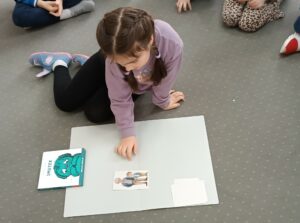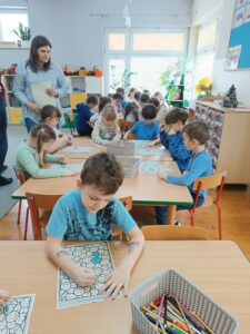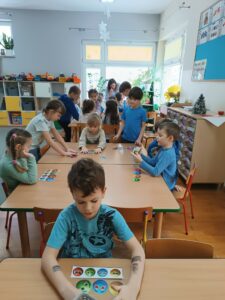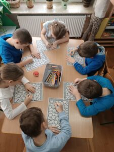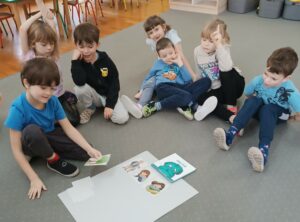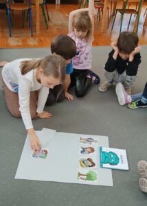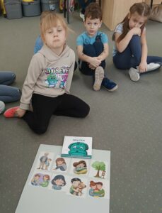 Kolejnym etapem spotkania była praca z materiałami obrazkowymi i dydaktycznymi. Przedszkolaki układały historyjki przedstawiające różne sytuacje emocjonalne, analizowały zachowania bohaterów oraz podejmowały próby nazywania uczuć. Działania te sprzyjały rozwijaniu empatii, koncentracji oraz myślenia przyczynowo-skutkowego.