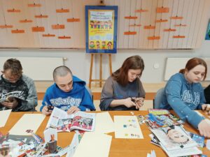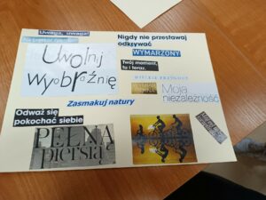 Najważniejszym punktem warsztatów było tworzenie kolaży słownych. Uczestnicy wycinali inspirujące słowa i frazy z gazet, a następnie łączyli je w nowe, często zaskakujące zestawienia. Efekty tej pracy były niezwykle różnorodne – od motywacyjnych haseł, przez humorystyczne połączenia, aż po refleksyjne przesłania.